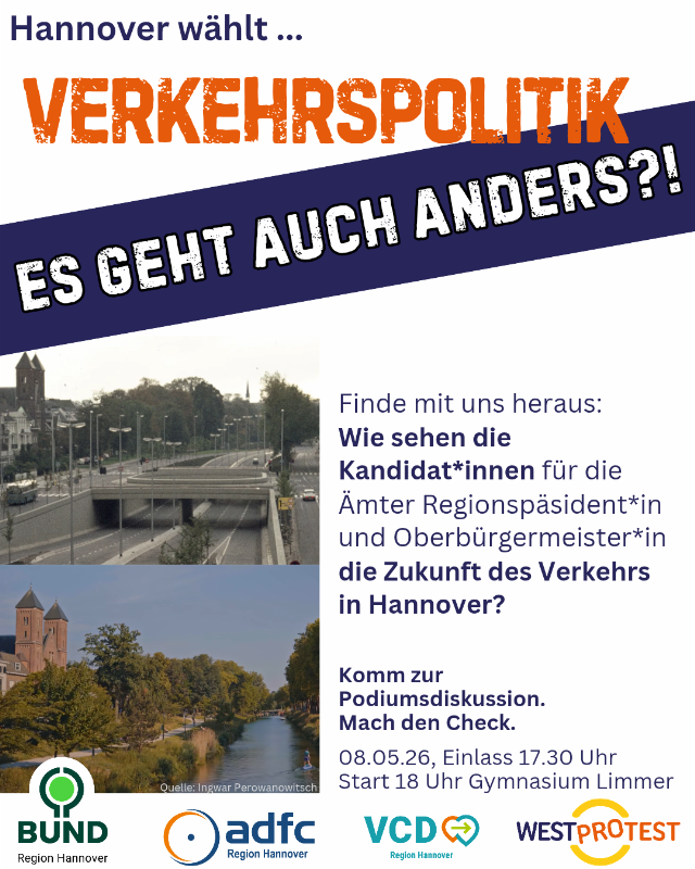 WESTprotest, BUND Region Hannover, ADFC Region Hannover und VCD KV Region Hannover e. V. laden ein zur Podiumsdiskussion mit den Kandidat*innen, die sich als Oberbürgermeister*in oder Regionspräsiden*in zur Wahl stellen.